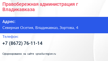 Правобережная администрация г. Владикавказа по адресу Северная Осетия, Владикавказ, Зортова, 4 в дальнейшем Организация, размещена в следующих категориях: