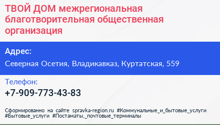 ТВОЙ ДОМ, межрегиональная благотворительная общественная организация по адресу Северная Осетия, Владикавказ, Куртатская, 559 в дальнейшем Организация, размещена в следующих категориях: