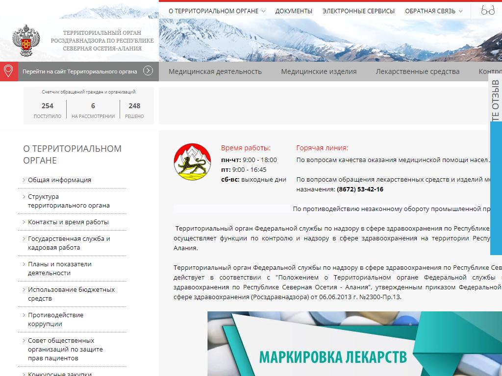 Территориальный орган Федеральной службы по надзору в сфере здравоохранения по Республике Северная Осетия-Алания по адресу Северная Осетия, Владикавказ, Джанаева, 22 в дальнейшем Организация, размещена в следующих категориях: