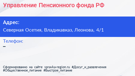 Управление Пенсионного фонда РФ по адресу Северная Осетия, Владикавказ, Леонова, 4/1 в дальнейшем Организация, размещена в следующих категориях:
