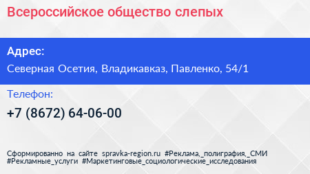 Всероссийское общество слепых по адресу Северная Осетия, Владикавказ, Павленко, 54/1 в дальнейшем Организация, размещена в следующих категориях: