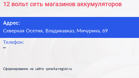 12 вольт, сеть магазинов аккумуляторов по адресу Северная Осетия, Владикавказ, Мичурина, 69 в дальнейшем Организация, размещена в следующих категориях: