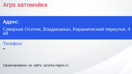 Агро, автомойка по адресу Северная Осетия, Владикавказ, Керамический переулок, 4 к8 в дальнейшем Организация, размещена в следующих категориях:
