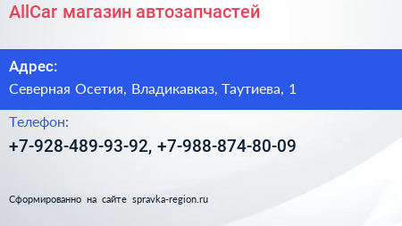 AllCar, магазин автозапчастей по адресу Северная Осетия, Владикавказ, Таутиева, 1 в дальнейшем Организация, размещена в следующих категориях: