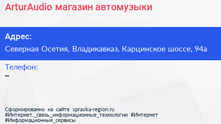 ArturAudio, магазин автомузыки по адресу Северная Осетия, Владикавказ, Карцинское шоссе, 94а в дальнейшем Организация, размещена в следующих категориях: