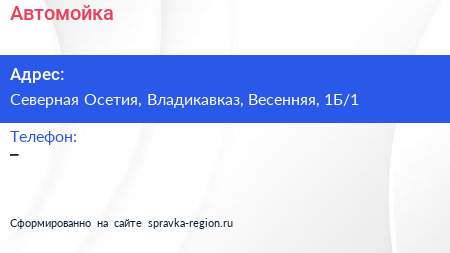 Автомойка по адресу Северная Осетия, Владикавказ, Весенняя, 1Б/1 в дальнейшем Организация, размещена в следующих категориях: