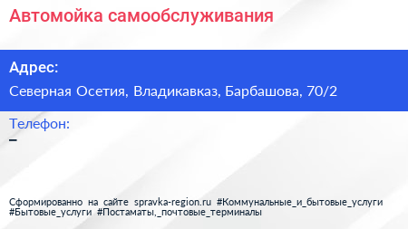 Автомойка самообслуживания по адресу Северная Осетия, Владикавказ, Барбашова, 70/2 в дальнейшем Организация, размещена в следующих категориях: