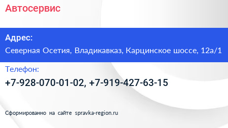 Автосервис по адресу Северная Осетия, Владикавказ, Карцинское шоссе, 12а/1 в дальнейшем Организация, размещена в следующих категориях: