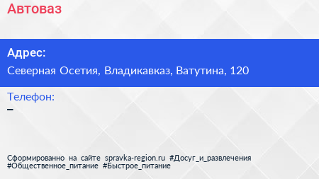 Автоваз по адресу Северная Осетия, Владикавказ, Ватутина, 120 в дальнейшем Организация, размещена в следующих категориях: