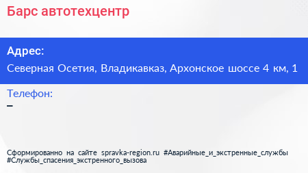 Барс, автотехцентр по адресу Северная Осетия, Владикавказ, Архонское шоссе 4 км, 1 в дальнейшем Организация, размещена в следующих категориях:
