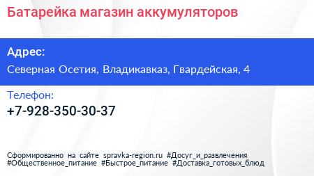 Батарейка, магазин аккумуляторов по адресу Северная Осетия, Владикавказ, Гвардейская, 4 в дальнейшем Организация, размещена в следующих категориях: