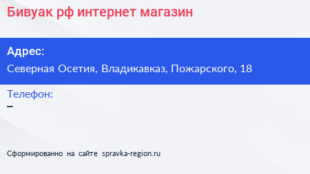 Бивуак.рф, интернет-магазин по адресу Северная Осетия, Владикавказ, Пожарского, 18 в дальнейшем Организация, размещена в следующих категориях: