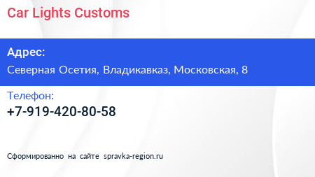 Car Lights Customs по адресу Северная Осетия, Владикавказ, Московская, 8 в дальнейшем Организация, размещена в следующих категориях: