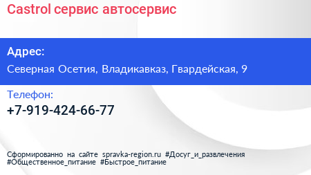 Castrol сервис, автосервис по адресу Северная Осетия, Владикавказ, Гвардейская, 9 в дальнейшем Организация, размещена в следующих категориях: