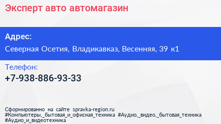Эксперт-авто, автомагазин по адресу Северная Осетия, Владикавказ, Весенняя, 39 к1 в дальнейшем Организация, размещена в следующих категориях: