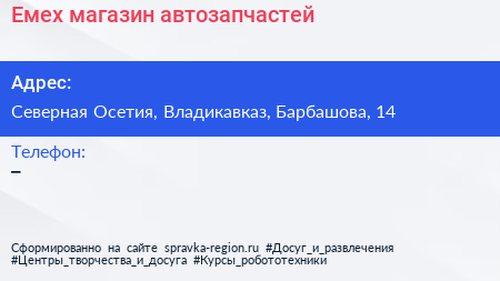 Eмех, магазин автозапчастей по адресу Северная Осетия, Владикавказ, Барбашова, 14 в дальнейшем Организация, размещена в следующих категориях: