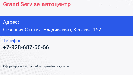 Grand Servise, автоцентр по адресу Северная Осетия, Владикавказ, Кесаева, 152 в дальнейшем Организация, размещена в следующих категориях: