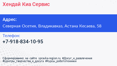 Хендай Киа Сервис по адресу Северная Осетия, Владикавказ, Астана Кесаева, 58 в дальнейшем Организация, размещена в следующих категориях: