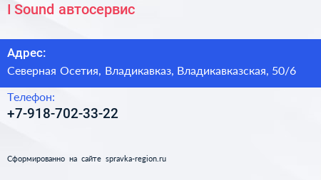 I Sound, автосервис по адресу Северная Осетия, Владикавказ, Владикавказская, 50/6 в дальнейшем Организация, размещена в следующих категориях: