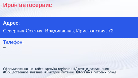 Ирон, автосервис по адресу Северная Осетия, Владикавказ, Иристонская, 72 в дальнейшем Организация, размещена в следующих категориях: