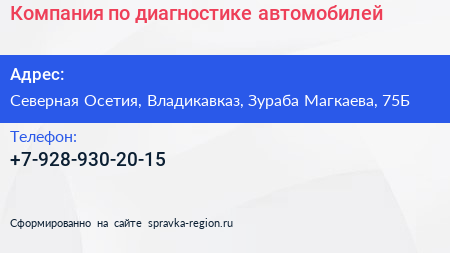 Компания по диагностике автомобилей по адресу Северная Осетия, Владикавказ, Зураба Магкаева, 75Б в дальнейшем Организация, размещена в следующих категориях: