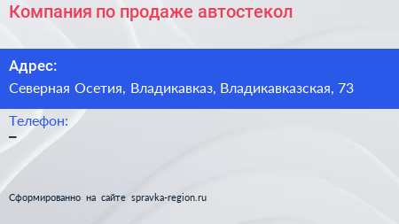Компания по продаже автостекол по адресу Северная Осетия, Владикавказ, Владикавказская, 73 в дальнейшем Организация, размещена в следующих категориях:
