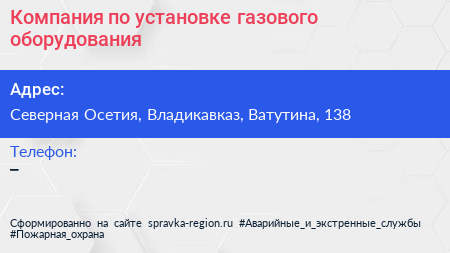 Компания по установке газового оборудования по адресу Северная Осетия, Владикавказ, Ватутина, 138 в дальнейшем Организация, размещена в следующих категориях: