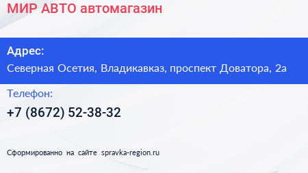 МИР АВТО, автомагазин по адресу Северная Осетия, Владикавказ, проспект Доватора, 2а в дальнейшем Организация, размещена в следующих категориях: