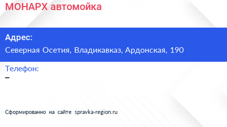 МОНАРХ, автомойка по адресу Северная Осетия, Владикавказ, Ардонская, 190 в дальнейшем Организация, размещена в следующих категориях: