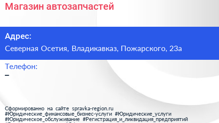 Магазин автозапчастей по адресу Северная Осетия, Владикавказ, Пожарского, 23а в дальнейшем Организация, размещена в следующих категориях: