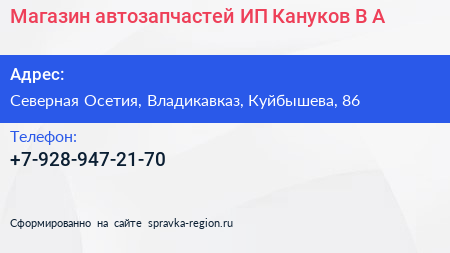 Магазин автозапчастей, ИП Кануков В.А. по адресу Северная Осетия, Владикавказ, Куйбышева, 86 в дальнейшем Организация, размещена в следующих категориях: