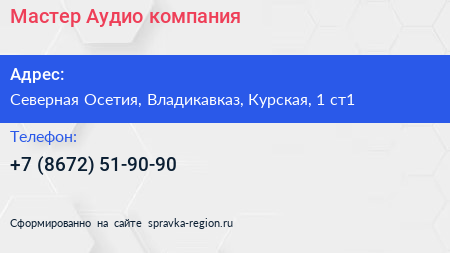 Мастер Аудио, компания по адресу Северная Осетия, Владикавказ, Курская, 1 ст1 в дальнейшем Организация, размещена в следующих категориях: