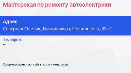 Мастерская по ремонту автоэлектрики по адресу Северная Осетия, Владикавказ, Пожарского, 23 к1 в дальнейшем Организация, размещена в следующих категориях: