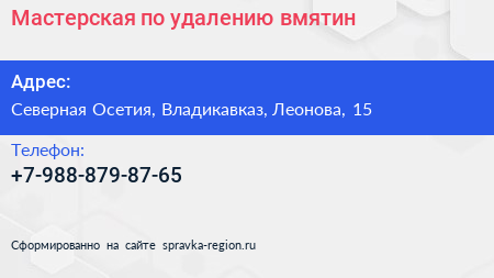 Мастерская по удалению вмятин по адресу Северная Осетия, Владикавказ, Леонова, 15 в дальнейшем Организация, размещена в следующих категориях: