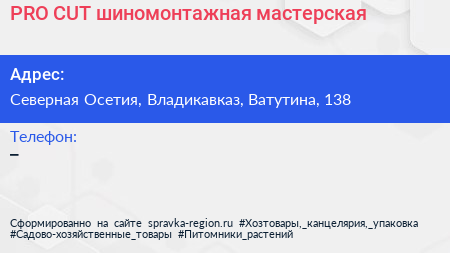 PRO-CUT, шиномонтажная мастерская по адресу Северная Осетия, Владикавказ, Ватутина, 138 в дальнейшем Организация, размещена в следующих категориях: