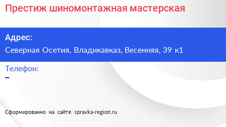 Престиж, шиномонтажная мастерская по адресу Северная Осетия, Владикавказ, Весенняя, 39 к1 в дальнейшем Организация, размещена в следующих категориях: