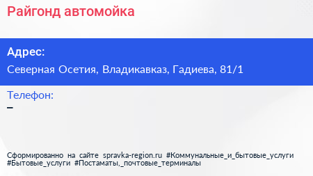 Райгонд, автомойка по адресу Северная Осетия, Владикавказ, Гадиева, 81/1 в дальнейшем Организация, размещена в следующих категориях: