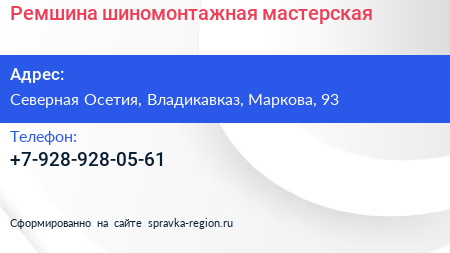 Ремшина, шиномонтажная мастерская по адресу Северная Осетия, Владикавказ, Маркова, 93 в дальнейшем Организация, размещена в следующих категориях: