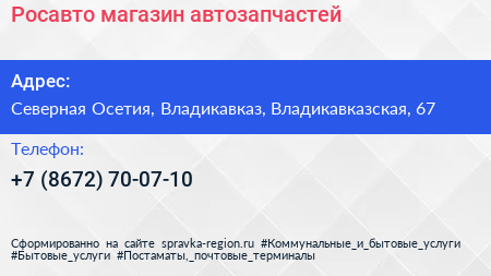 Росавто, магазин автозапчастей по адресу Северная Осетия, Владикавказ, Владикавказская, 67 в дальнейшем Организация, размещена в следующих категориях: