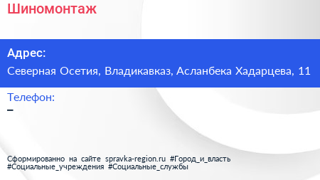 Шиномонтаж по адресу Северная Осетия, Владикавказ, Асланбека Хадарцева, 11 в дальнейшем Организация, размещена в следующих категориях: