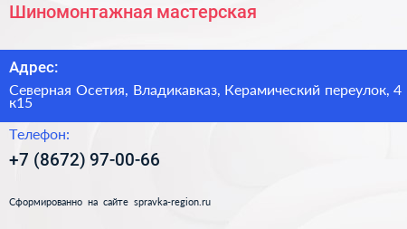 Шиномонтажная мастерская по адресу Северная Осетия, Владикавказ, Керамический переулок, 4 к15 в дальнейшем Организация, размещена в следующих категориях: