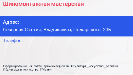 Шиномонтажная мастерская по адресу Северная Осетия, Владикавказ, Пожарского, 23Б в дальнейшем Организация, размещена в следующих категориях: