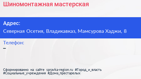Шиномонтажная мастерская по адресу Северная Осетия, Владикавказ, Мамсурова Хаджи, 8 в дальнейшем Организация, размещена в следующих категориях: