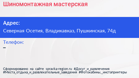 Шиномонтажная мастерская по адресу Северная Осетия, Владикавказ, Пушкинская, 74д в дальнейшем Организация, размещена в следующих категориях: