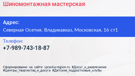 Шиномонтажная мастерская по адресу Северная Осетия, Владикавказ, Московская, 16 ст1 в дальнейшем Организация, размещена в следующих категориях: