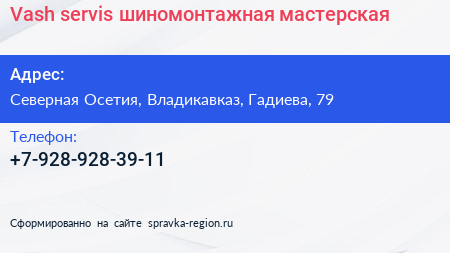 Vash servis, шиномонтажная мастерская по адресу Северная Осетия, Владикавказ, Гадиева, 79 в дальнейшем Организация, размещена в следующих категориях: