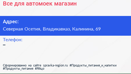 Все для автомоек, магазин по адресу Северная Осетия, Владикавказ, Калинина, 69 в дальнейшем Организация, размещена в следующих категориях: