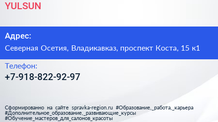 YULSUN по адресу Северная Осетия, Владикавказ, проспект Коста, 15 к1 в дальнейшем Организация, размещена в следующих категориях: