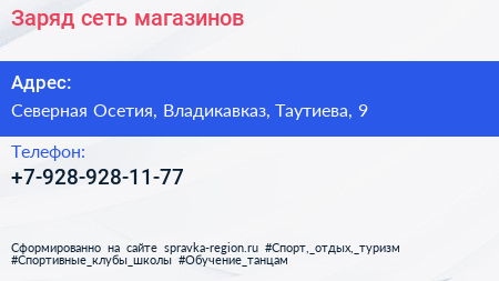 Заряд, сеть магазинов по адресу Северная Осетия, Владикавказ, Таутиева, 9 в дальнейшем Организация, размещена в следующих категориях:
