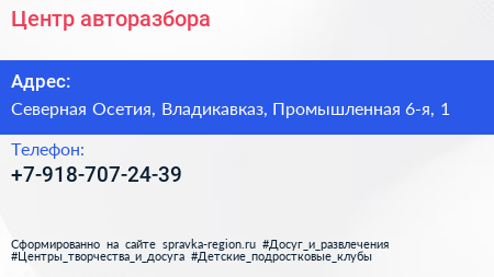 Центр авторазбора по адресу Северная Осетия, Владикавказ, Промышленная 6-я, 1 в дальнейшем Организация, размещена в следующих категориях:
